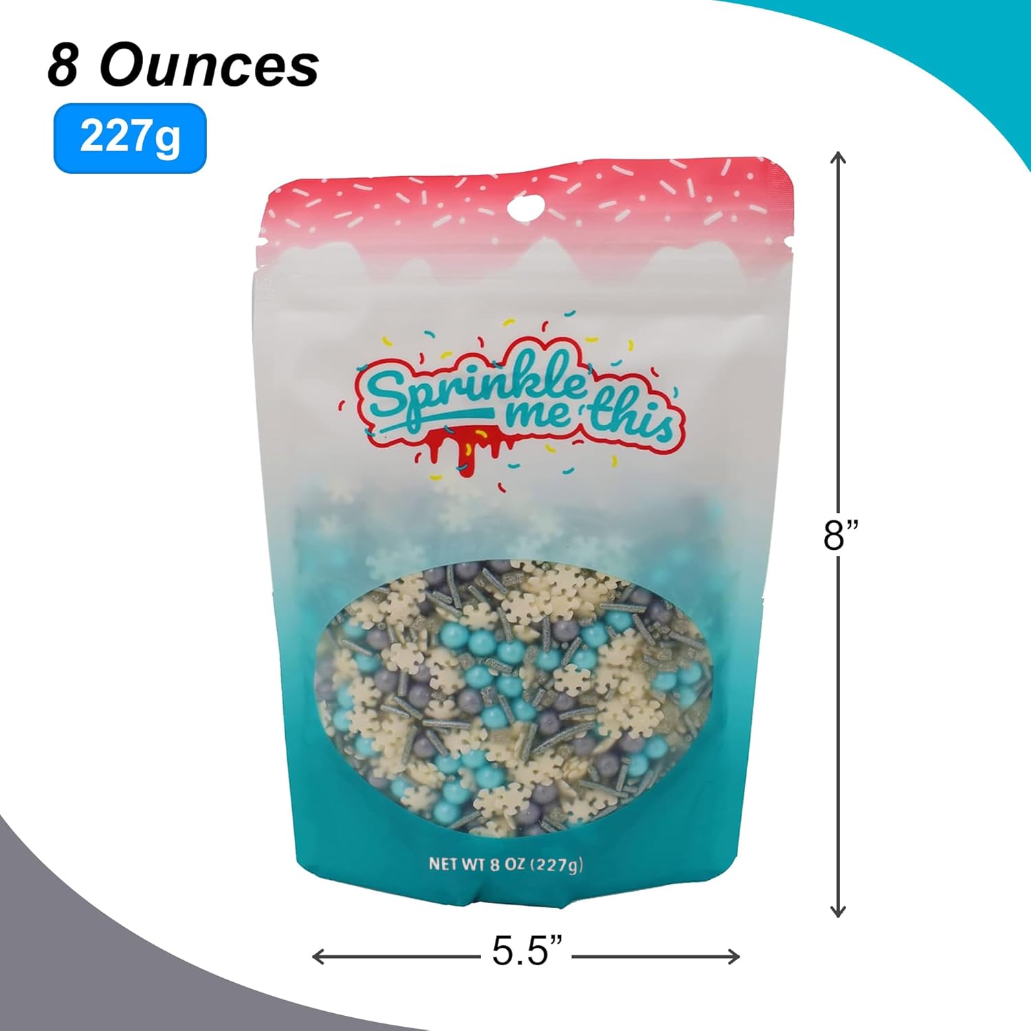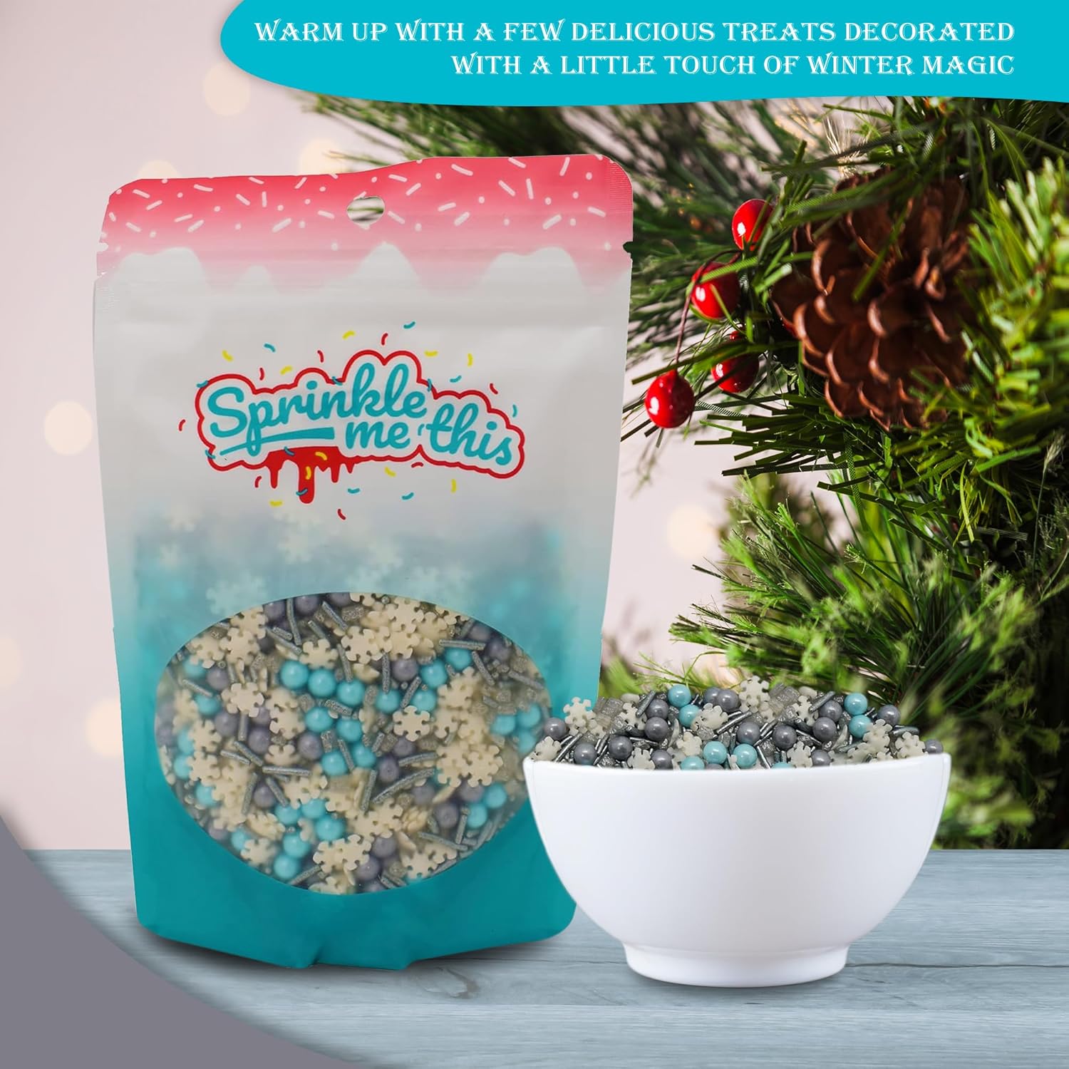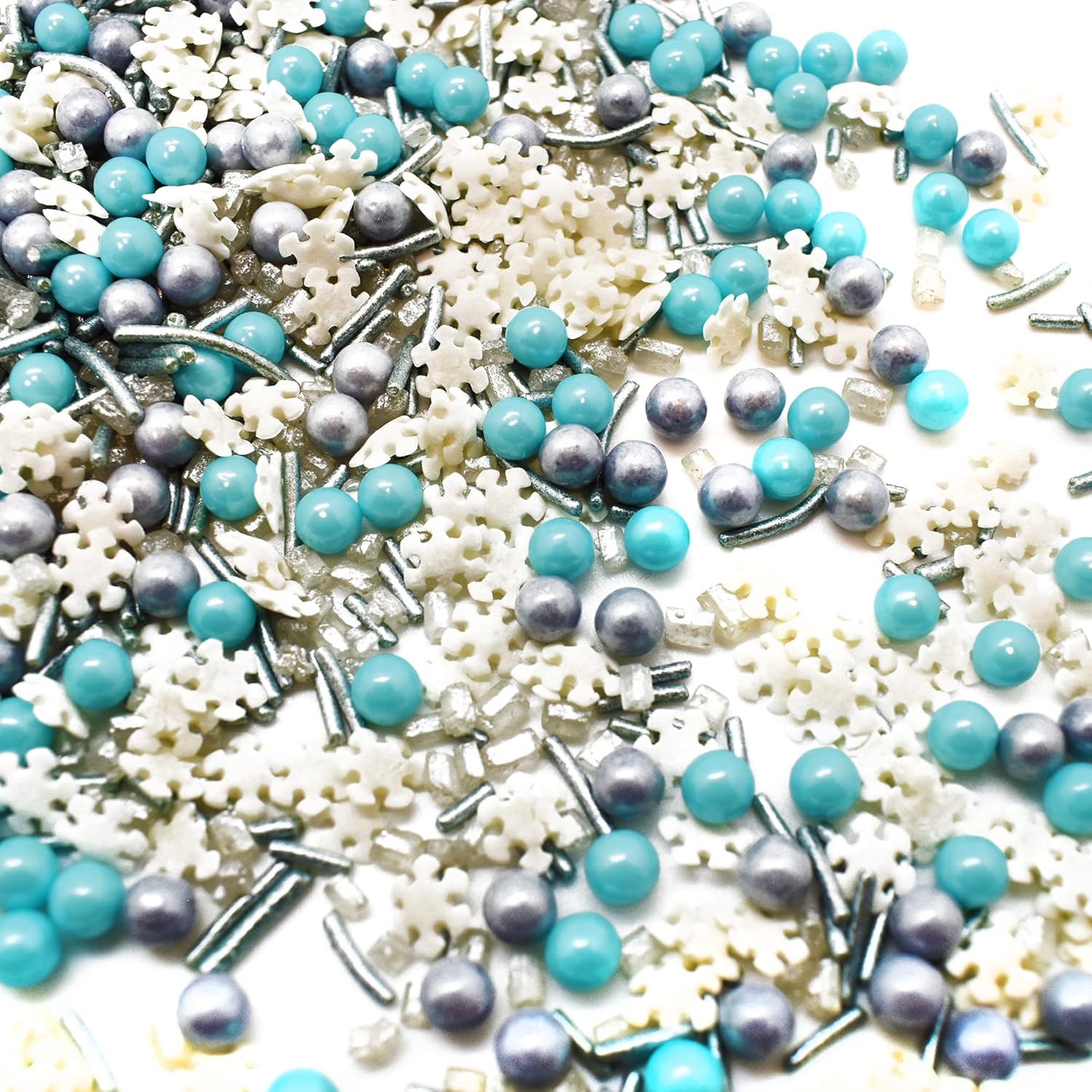 - Capture some of the magic of winter with this beautiful mix of sprinkles inspired by the holiday season. This resealable bag contains a mixture of blue and silver pearls, silver jimmies and beautiful white snowflake quins.